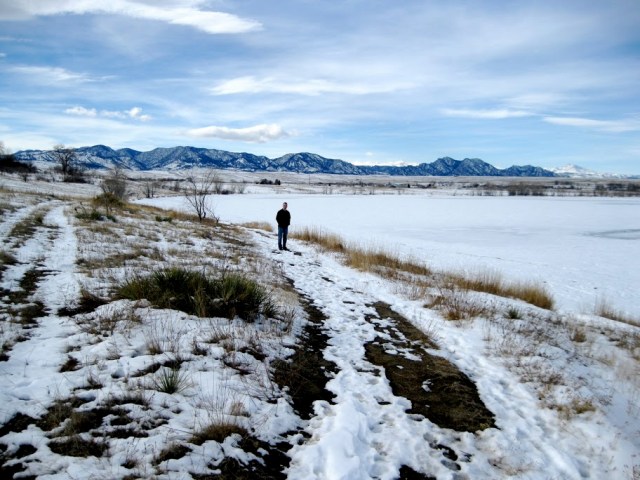 Luke next to frozen Standley Lake.